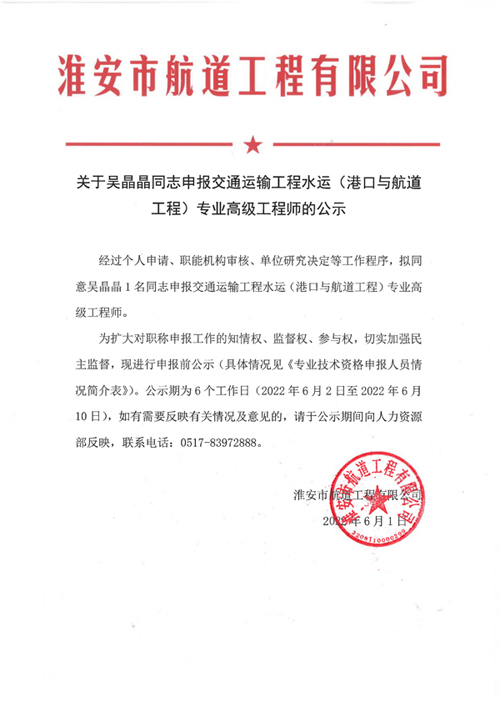 關(guān)于吳晶晶同志申報(bào)交通運(yùn)輸工程水運(yùn)(港口與航道工程)專業(yè)高級(jí)工程師的公示